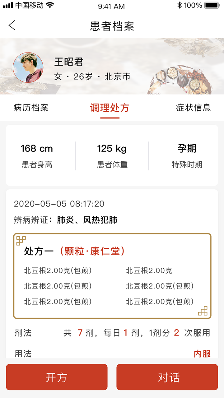 1、进入患者档案,可查看病历、调理处方、症状信息,了解患者健康情况。