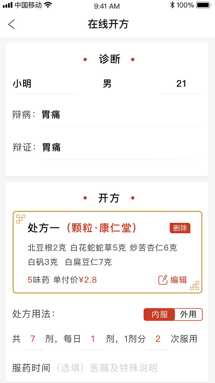 2、在线开方时,填写诊断信息,开具含药品、用法的处方,还可编辑删除。