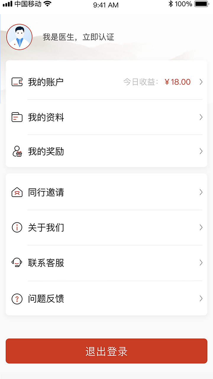 3、医生认证后,在我的页面管理账户、资料,查看收益,处理问题反馈。