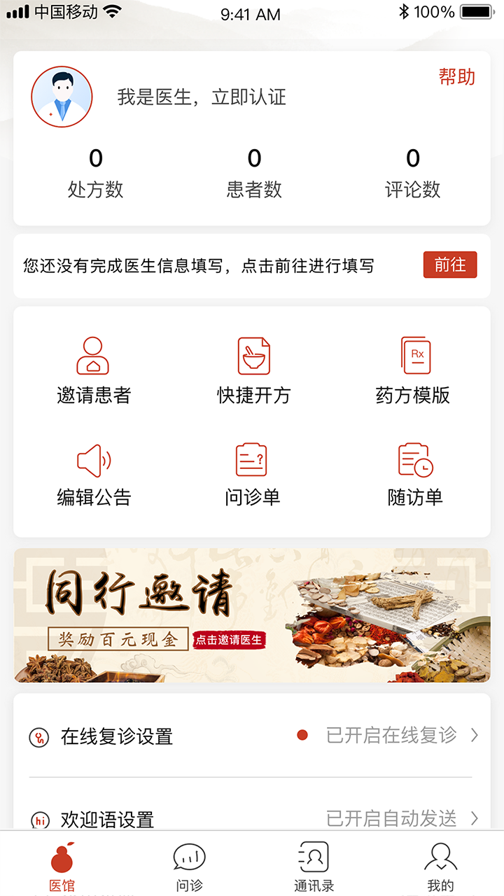 4、利用邀请患者、快捷开方等功能,开启在线复诊,设置欢迎语,高效行医。