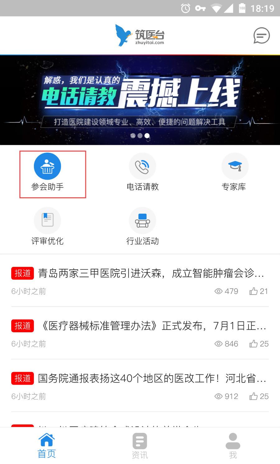 1、打开软件进入首页,可点击参会助手、电话请教等功能模块,还能浏览医疗资讯。