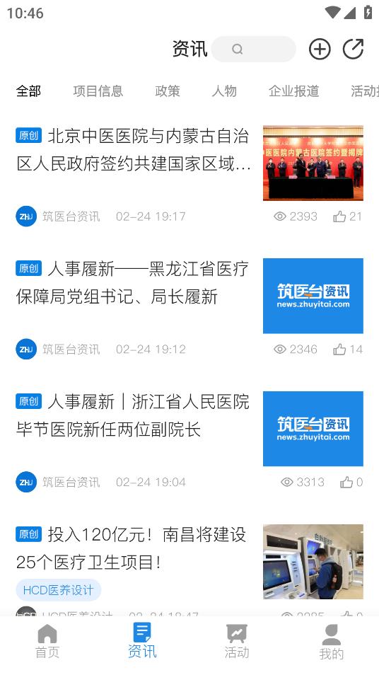 3、点击资讯板块,可查看全部、项目信息、政策等分类医疗资讯,了解行业动态。