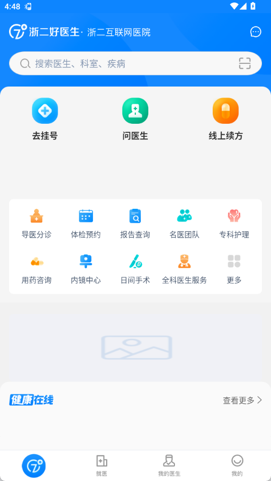 1、进入首页,可挂号、问医生、线上续方,还能进行导医分诊、体检预约等。
