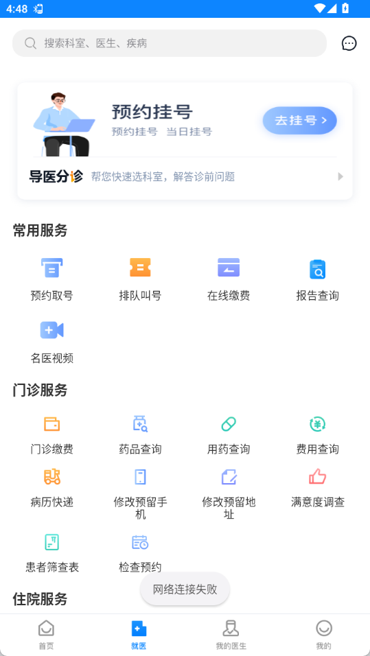 2、就医板块,预约挂号、导医分诊,使用常用服务和门诊服务。