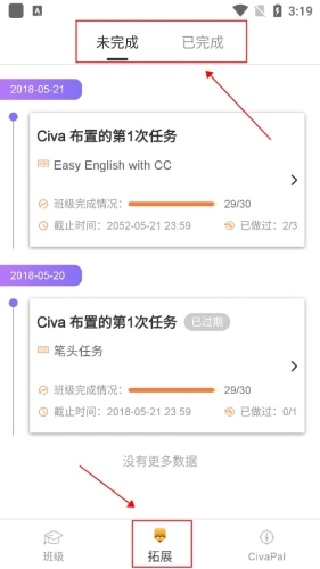 4.之后在【拓展】界面中,自己之前练习或完成任务的所有信息便可看到;