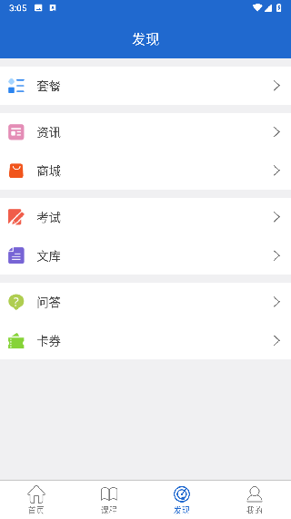6.在发现页面可以查看考试资讯以及文库,点击问答进入专区在线提问,点击商城可以购物