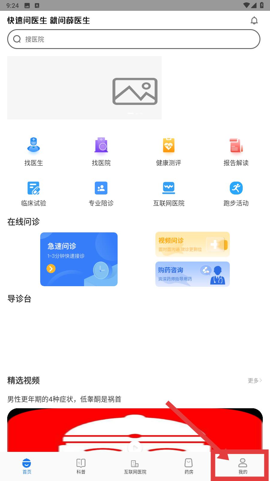 2、进入首页,使用找医生、健康测评等功能,参与在线问诊如急速问诊、视频问诊。