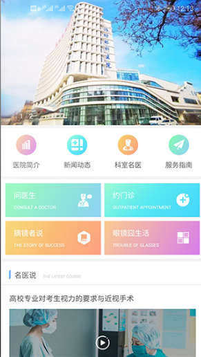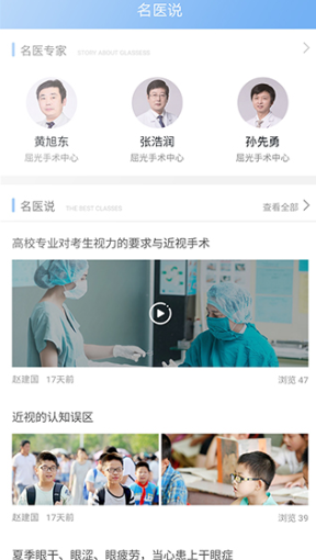 1、浏览医院简介、科室名医,查看名医说的近视知识和手术讲解。
