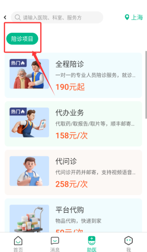 2、选择陪诊项目,如全程陪诊、代问诊等,根据需求下单。