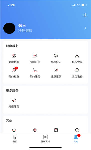 2、点击我的,管理健康档案、检测报告,绑定健康设备,享受私人管家服务。
