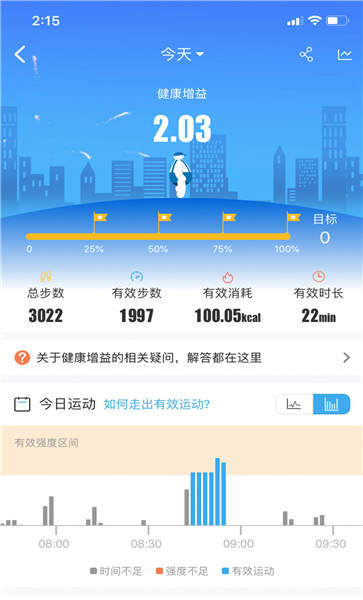 3、查看今日健康增益,了解总步数、有效消耗等运动详情,掌握健康进度。