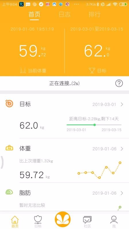 1、进入首页,查看当前体重、目标体重,以及体重、脂肪等数据变化。