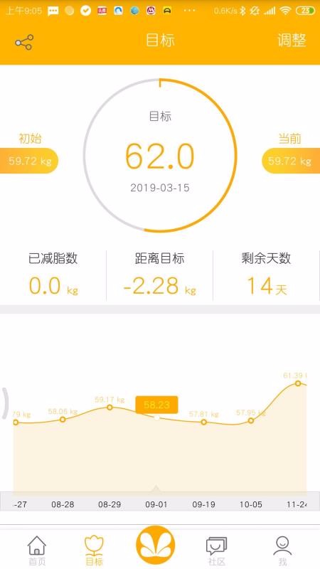 2、查看减脂目标、已减脂数、距离目标和剩余天数,了解体重趋势。