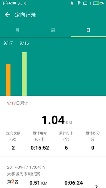 4、查看定向记录的日周月数据,了解定向距离、次数、打卡数和积分。
