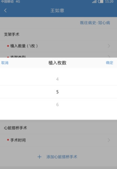 4、病史页面,选择手术类型,设置植入数量等信息后确定。