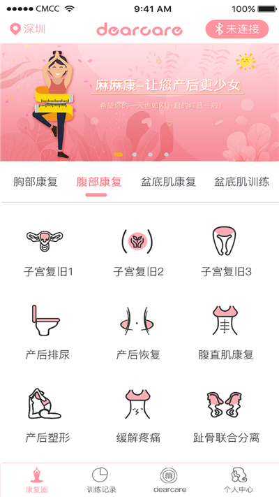 1、进入主页面,选择腹部康复等板块,挑选对应的产后恢复项目。