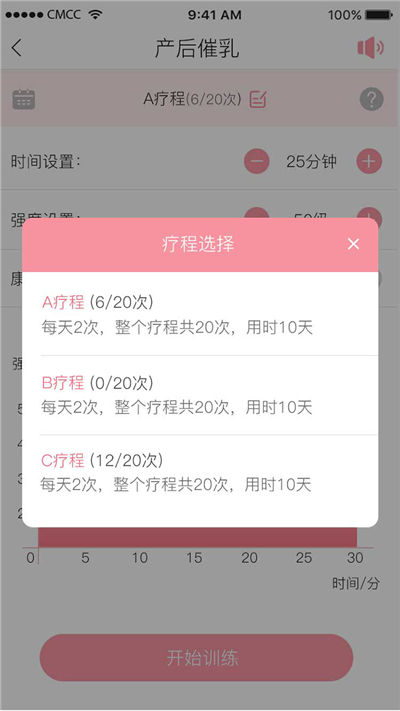 2、进入产后催乳页面,选择A疗程等合适的疗程,设置时间和强度。