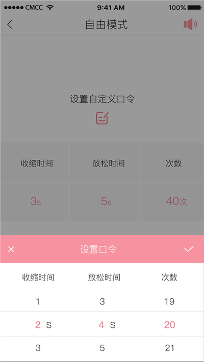 3、自由模式设置自定义口令,调整收缩放松时间及训练次数。