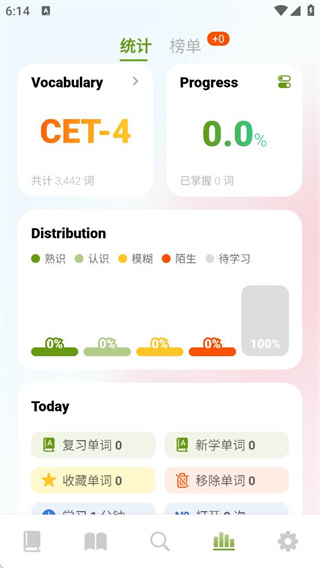 3、在统计页面可以查看每天的单词学习情况,通过榜单了解好友学习进度。