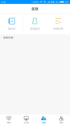 1、打开软件进入医联主界面,可选择通讯录添加医生或查看申请列表,也能浏览消息列表。