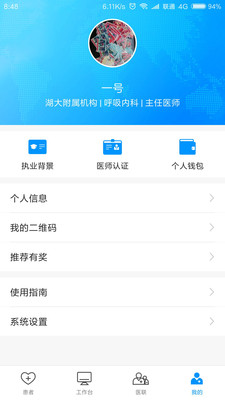 2、进入我的页面,可查看个人执业资质等信息,也能找到我的二维码推荐有奖等功能选项。