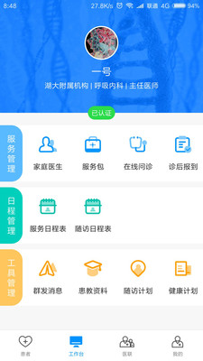 3、切换到工作台页面,能使用家庭医生服务包等服务管理功能,还可查看服务日程。