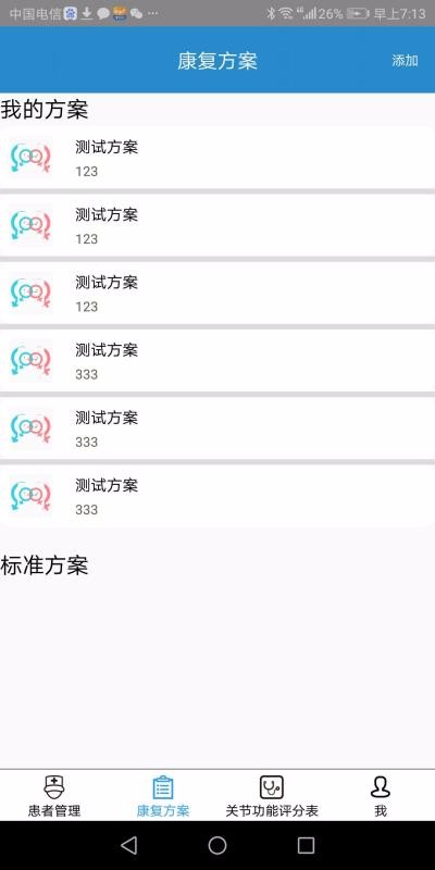 4、康复方案页面,查看我的方案列表,可添加新的康复方案,辅助患者康复管理。