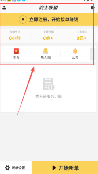3、认证通过后返回主界面,能看到今日收入、完成单数和在线时长等数据,想要开始接单的话,记得点击听单设置里的开始听单按钮;