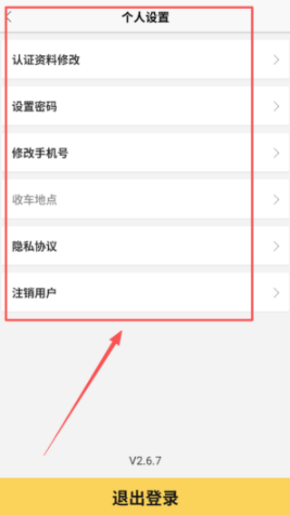 4、在个人设置页面可以修改认证资料、设置密码和更改手机号,如果需要设置常用收车地点,或者查看隐私协议,都可以在这里操作。