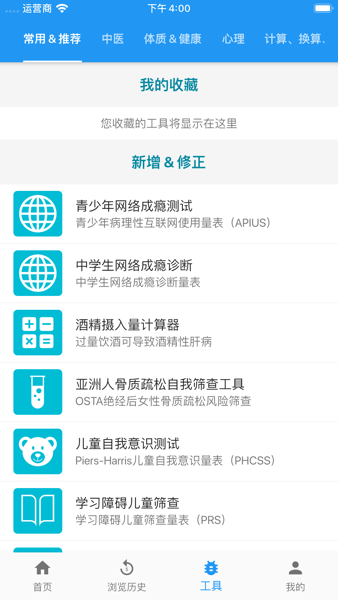4、打开工具页面,选择新增的测试工具,使用青少年网络成瘾测试等功能辅助评估。