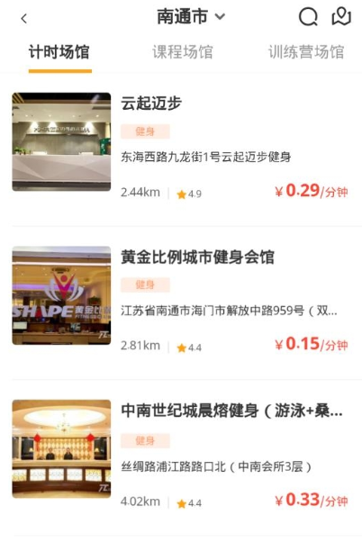 3、进入计时场馆列表,查看附近健身房的位置、评分及收费标准,选择合适场馆。