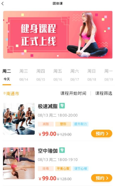 2、点击首页的团课选项,进入团课页面,查看不同日期的健身课程安排。