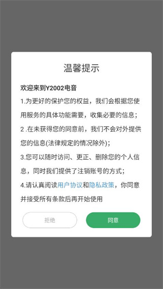1、打开Y2002电音App,首次使用需阅读并同意其安全隐私协议。