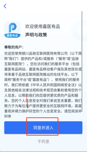 1、打开嘉医有品,阅读声明与政策后点击同意并进入,进入应用首页。