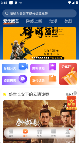 3. 点击页面下方的“视频”,就能看到影视分类、影视收藏、观看历史等功能;