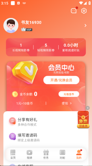 4. 点击页面下方的“我的”,就能看到会员中心、分享有好礼等功能。