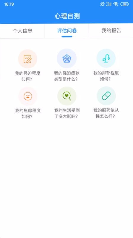 2、进入专项评估模块,选择ocd筛查、抑郁自评等测评工具