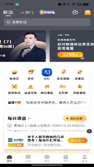 云极app是一款专为金融领域从业者打造的学习交流平台,用户可在此结识行业伙伴,系统化学习各类金融知识。平台内置专属云课堂模块,提供海量金融课程资源,支持随时随地在线学习。通过持续学习与知识积累,用户可显著提升金融专业素养。除课程学习外,平台还支持同行间的实时互动交流,用户可自由参与热门话题讨论或创建专属话题,深度洞察行业动态。平台整合了多元化金融学习栏目,全面满足用户社交与学习双重需求。