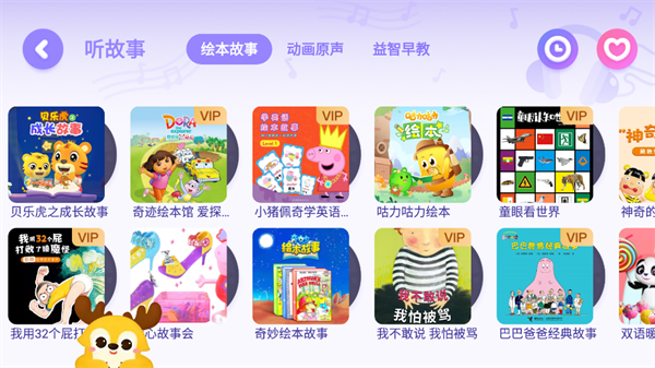 5、除视频内容外,特别设置"儿歌专区"和"故事天地"等音频模块,适配多场景使用需求;