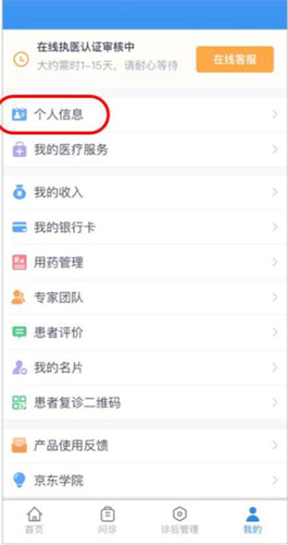 2、进入"医师认证"通道,提交专业资质证明后解锁在线问诊权限