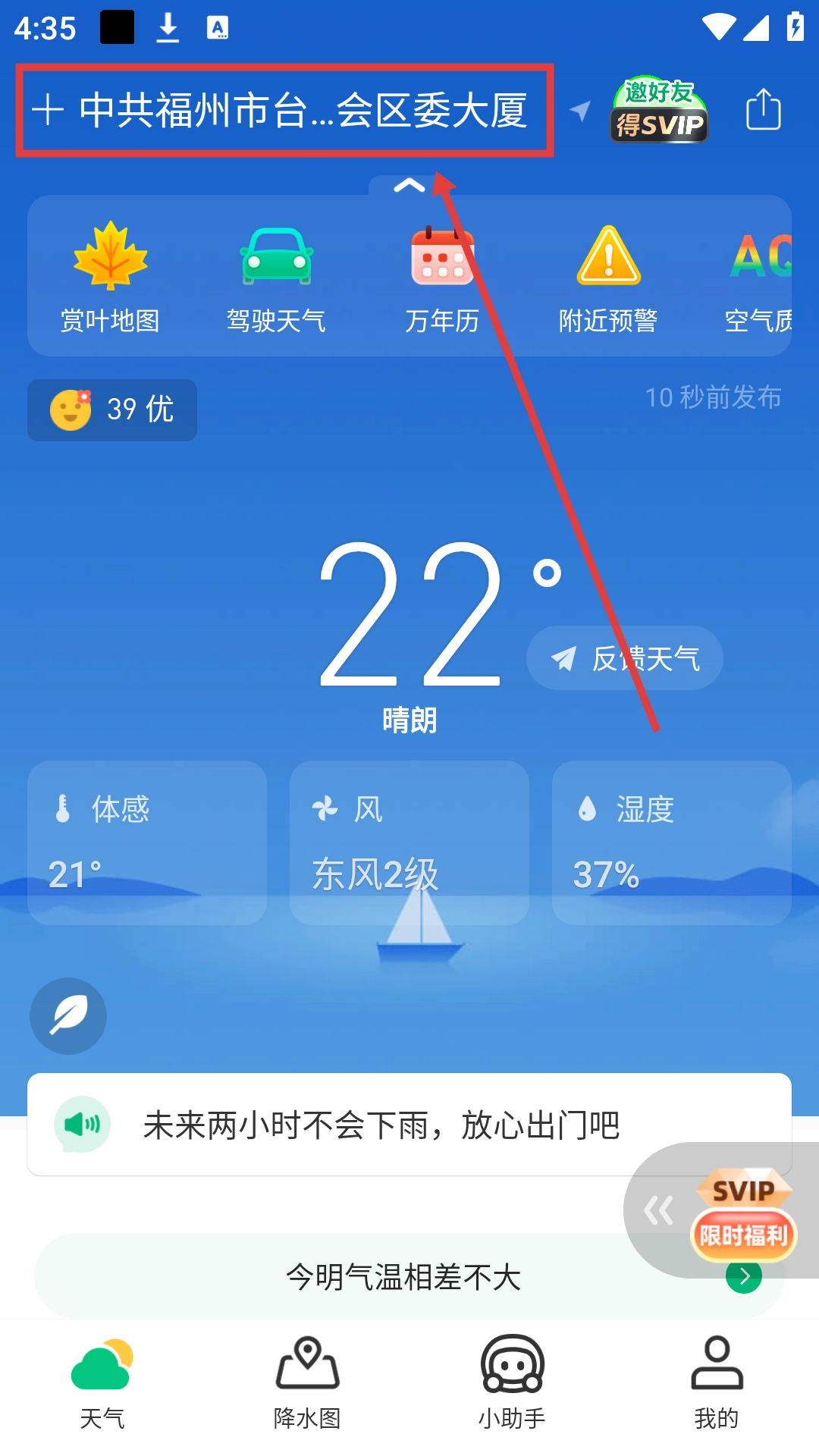 于天气应用顶部,点击地址栏,即可进入地址选择界面切换城市。
