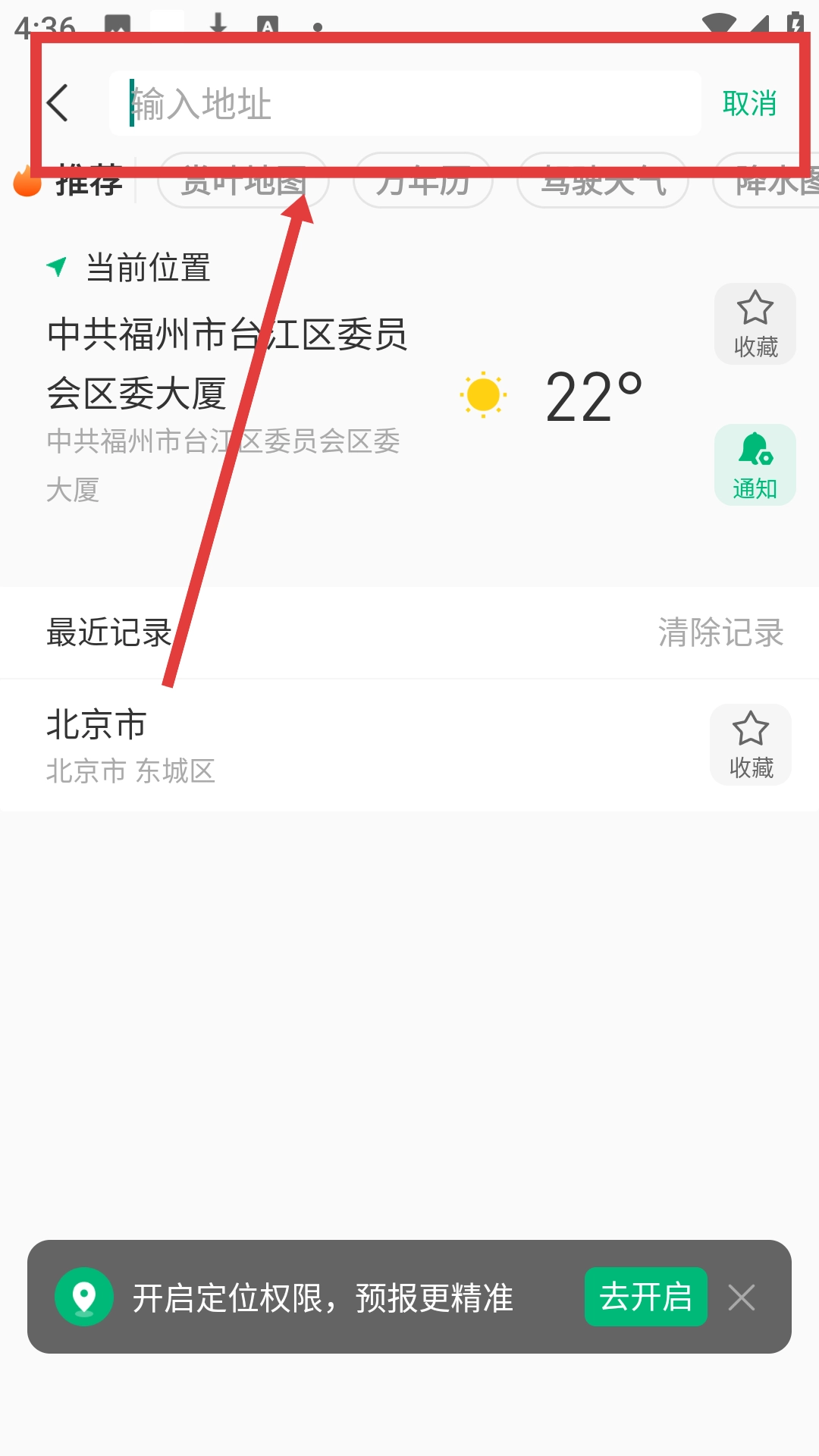 在地址选择界面,点击【输入地址】栏,便能输入城市名称查询天气。