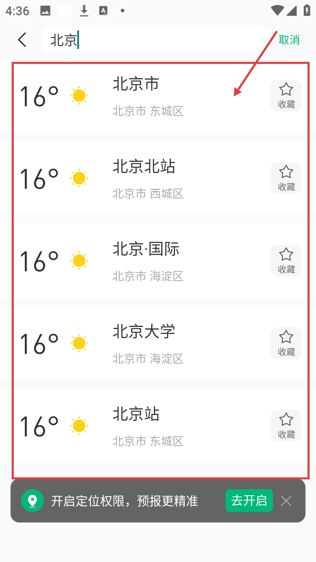 输入城市名称后,系统会呈现相关地点列表,您能按需选择对应地点查看天气状况。