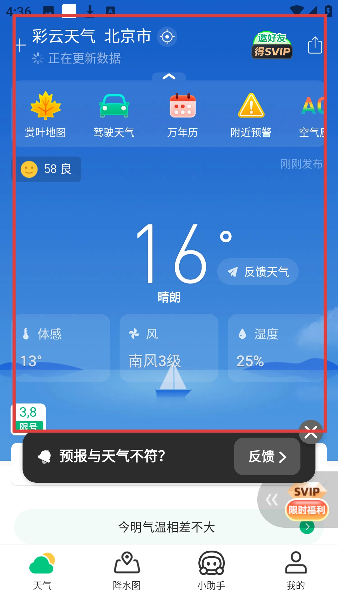 会实时更新天气信息,使用户掌握最新天气情况,并依最新天气给出相应指导。