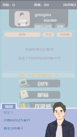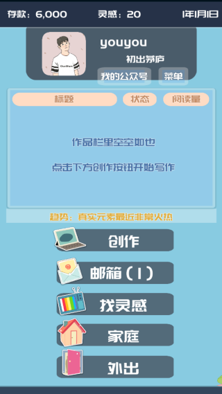3.如下图,点击“创作”开始编写文章,点击“家庭”可以推进剧情对话,点击“邮箱”会接到各种任务。