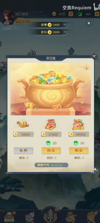 2、刷新聚宝盆,可以获得一定数量的元宝以及铜钱,大概五分分钟刷新一次,可以选择购买。