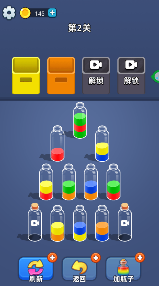 2.玩家可以在单人模式中逐步挑战各个关卡,解锁新的场景和任务,每一关都有明确的目标和难度,玩家需要通过自己的思考和操作,完成水滴的排序与消除任务;