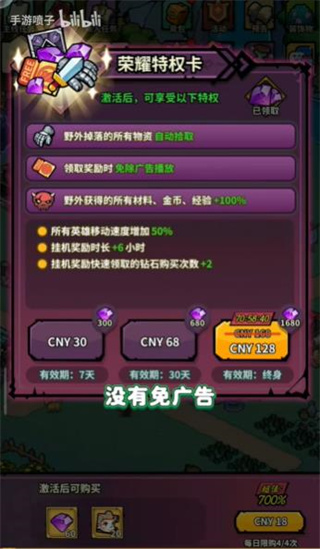3、在游戏中我们没有免广告可以选择,只能通过“荣耀特权卡”来提升自己获取资源的能力;