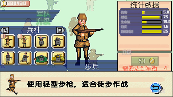 游戏中有大量不同属性的兵种可以选择,如狙击手、迫击炮、火箭筒和坦克等;每个兵种都有自己独特的特点和战斗技能,玩家可以根据自己的喜好和策略需求来合理搭配和使用;