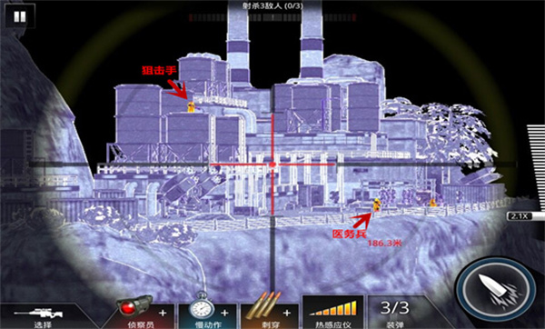 2、在整个任务中,你会遇到狙击手和步兵。狙击手是本任务必须无一漏杀的关键角色,在遇到后,需要火速击杀,否则他们手中的枪足以让装甲车炸毁,而你的任务也会失败。